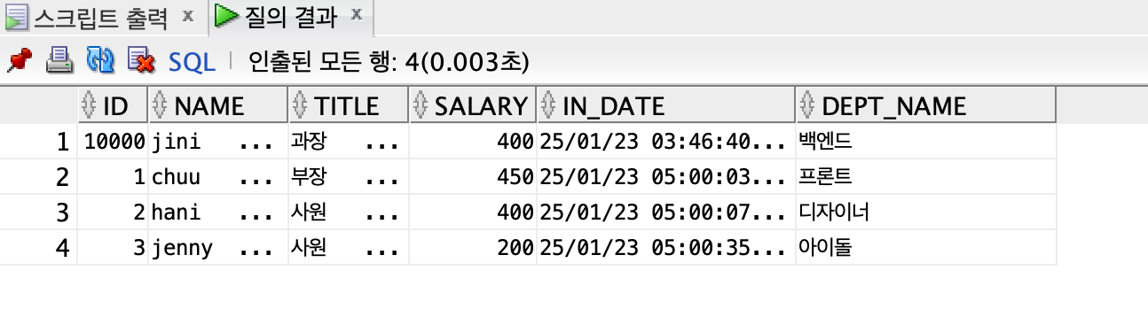 | Column 명 | Id | name | salary | title | In_date | dept_name |