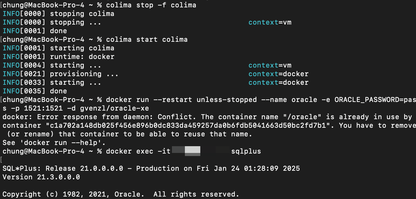 colima > docker > sqlplus 순서로 실행시켰기 때문에, 시스템 종료는 반대 순서(sqlplus > docker > colima)로 진행하면 된다.