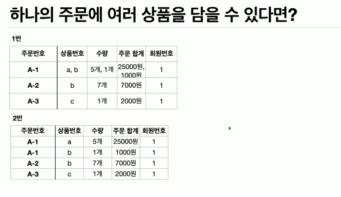 1번이 실제로 구현되기 힘든 이유: 주문한 상품들이 많아지면 컬럼들이 지저분해져 분석하기 힘들다.