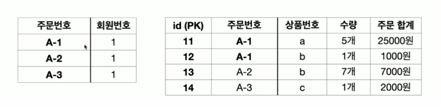 위의 사진에서는 주문 테이블들의 주문들이 구분이 안되기 때문에 주문번호(PK)가 필요하다.