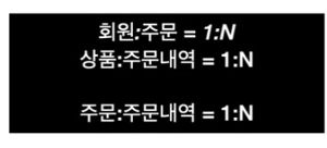 상품-주문의 관계 : 직접적인 관계는 없지만, 중간에 주문 내역 테이블을 중간에 두고 관계를 간접적으로 맺고 있다.