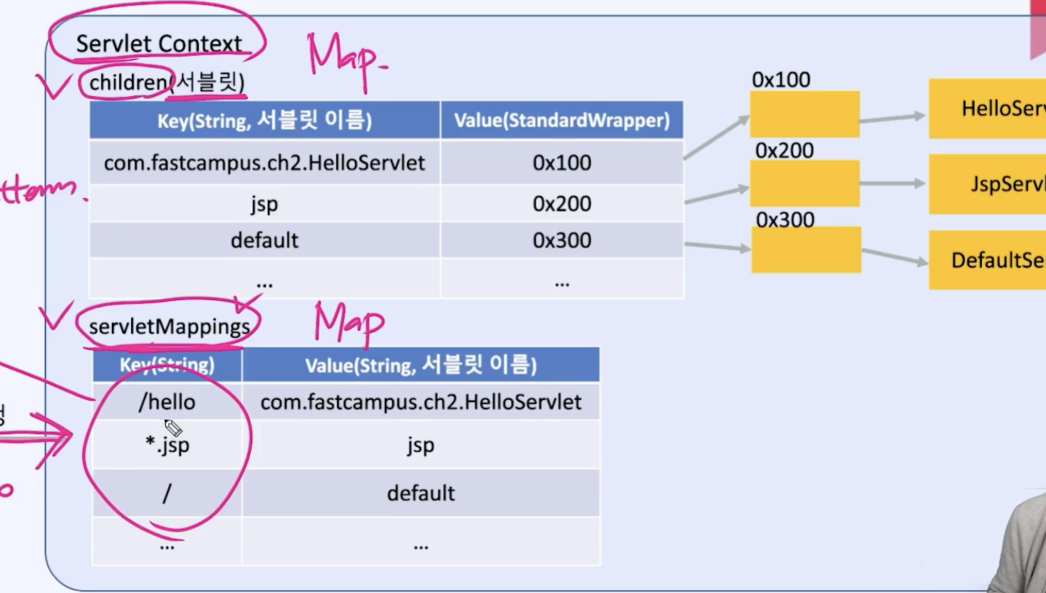 Spring에서 프로젝트를 진행할 때는 서블릿이나 JSP 파일을 직접 등록하지 않아도, 모든 요청은 DispatcherServlet이 처리한다. DispatcherServlet 안에는 servletMapping과 같은 매핑 정보가 포함되어 있다.