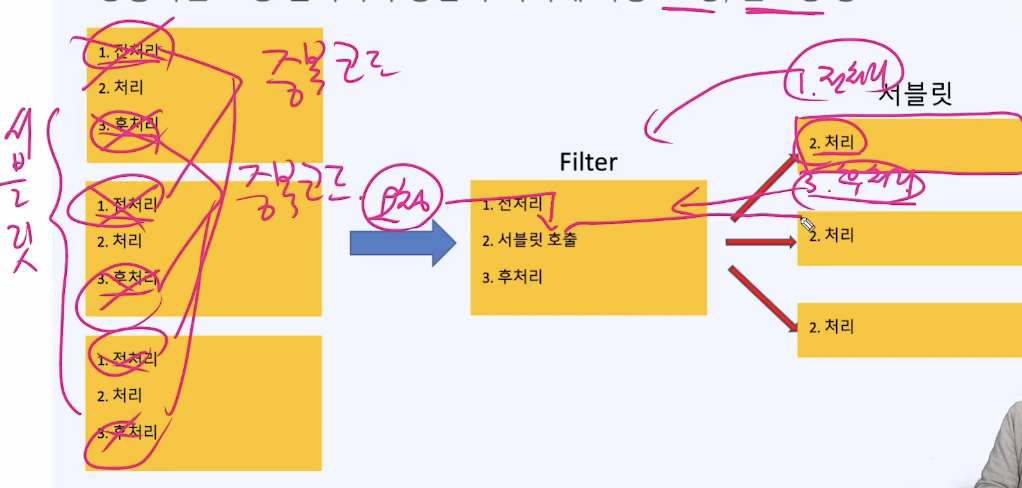 필터는 요청 전처리와 응답 후처리를 담당하는 컴포넌트이다. 로깅, 인코딩 설정, 권한 체크 등을 필터에서 처리할 수 있다. 필터는 여러 개가 있을 수 있으며, 공통적인 작업을 여러 요청에 대해 수행할 수 있다.