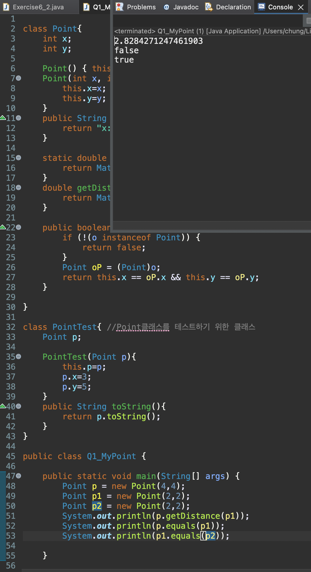 - Point 객체의 x와 y의 값이 같을 때만 true를 반환