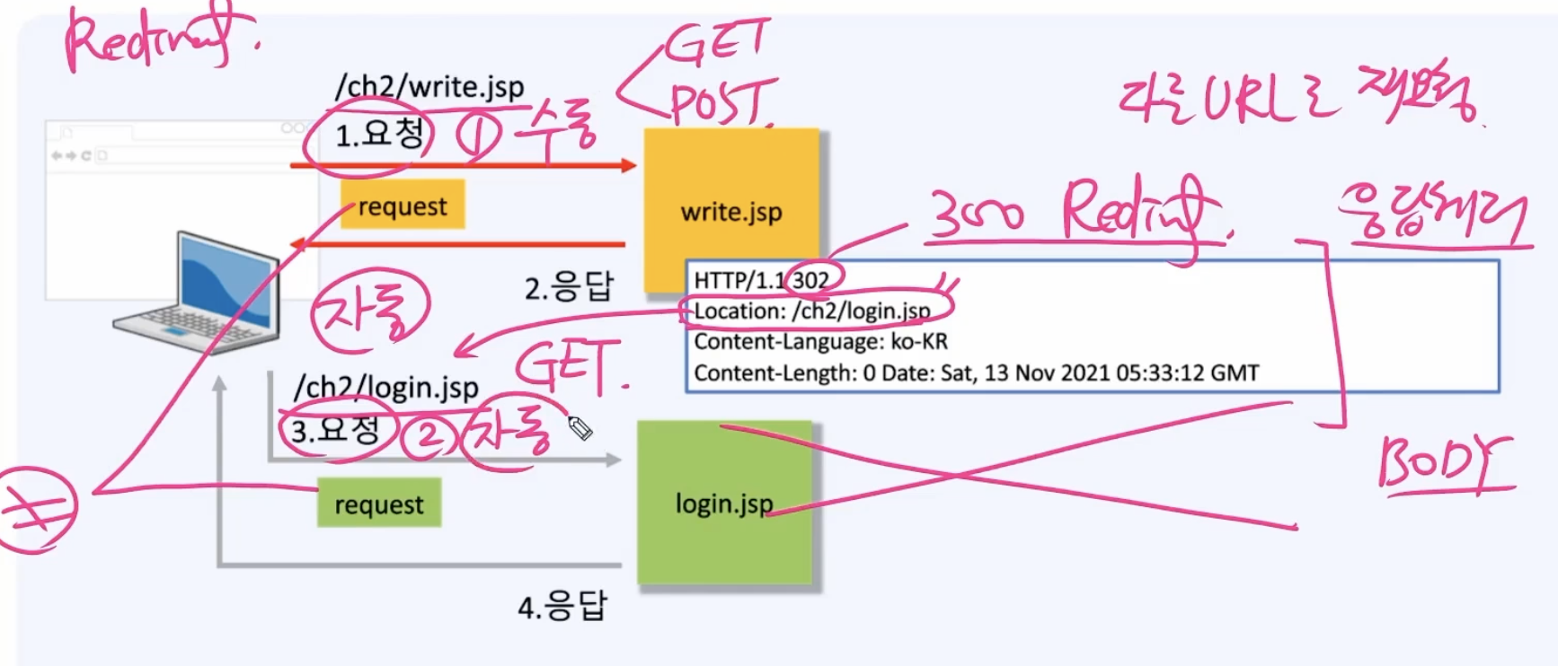 redirect와 foward 처리 과정 비교Redirect클라이언트가 /ch2/write/jsp를 요청했다. write.jsp가 302번으로 응답을 했다. 상태 코드 300번대는 리다이렉트(다른 URL로 재요청)를 의미한다. 상태코드가 300번대인 리다이렉트는 응답 헤더만 있고 바디는 없다.>> 어디로 요청해야할지 location을 헤더 정보에 준다. 브라우저가 자동으로 이 location에서 알려준대로 새로운 요청을 한다.1번 요청은 클라이언트가 요청한 것이고, 3번 요청은 브라우저가 자동으로 요청한 것이다. 1번 요청이 GET/POST 상관없이 리다이엑트에서 자동으로 요청되는 3번은 GET으로 요청된다. Forward클라이언트가 write.jsp한테 요청을 한다.write.jsp가 자기가 처리..